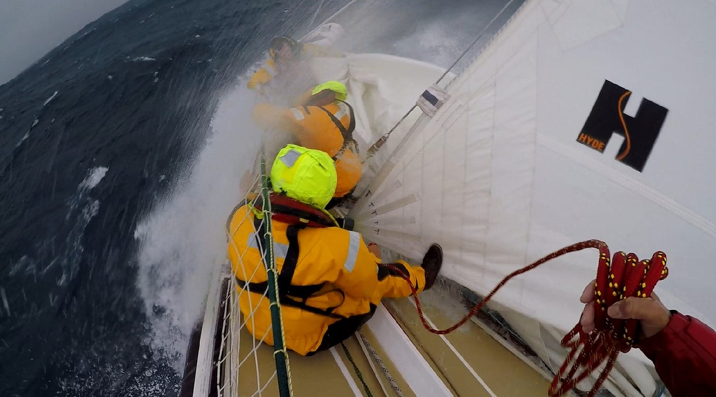 Upwind, life on deck is antisocial. Hoods are up, faces are lowered, and staying dry and warm takes precedent over conversation.